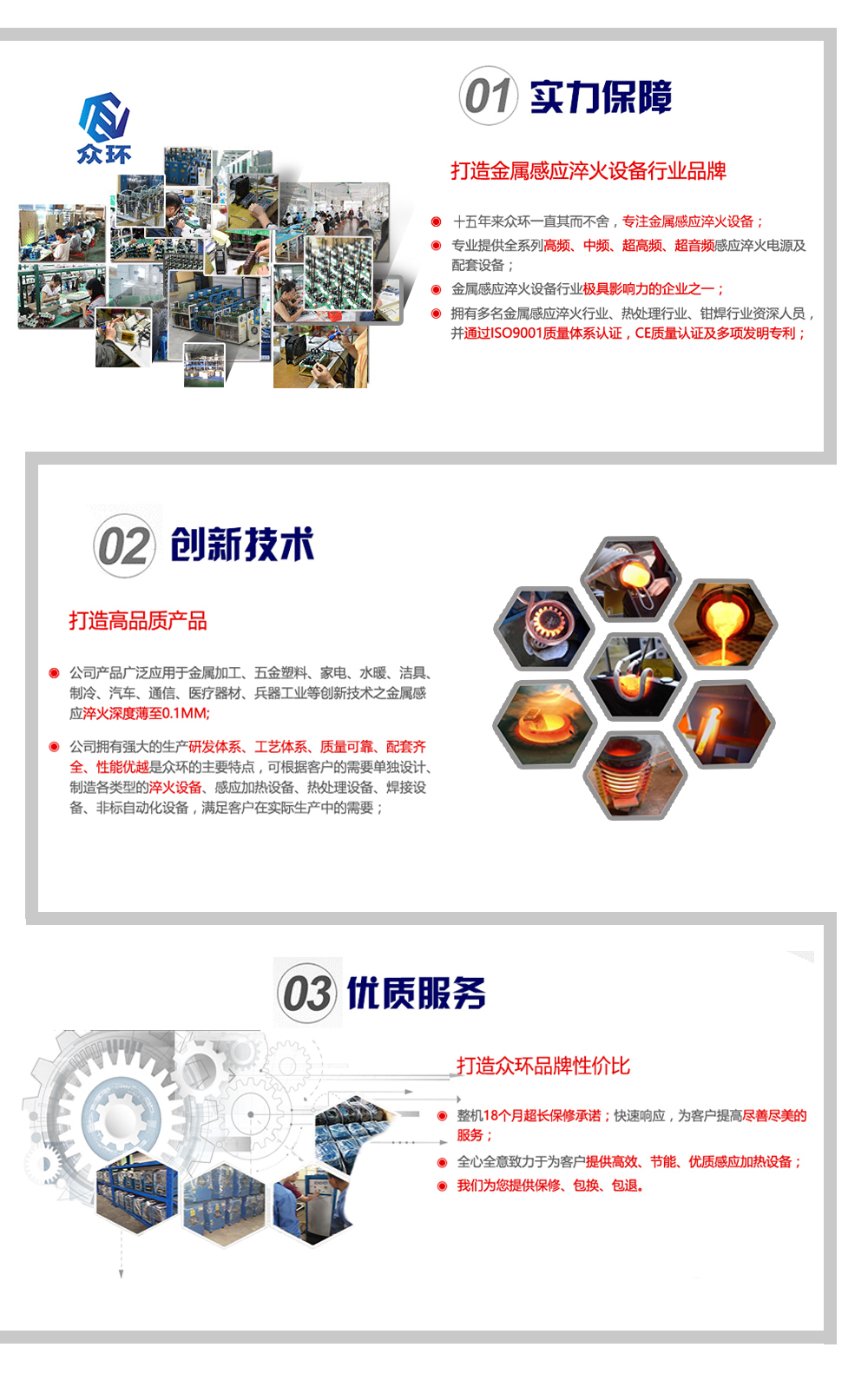 公司成立于2006年8月,是一家專(zhuān)注于研發(fā)、生產(chǎn)和銷(xiāo)售感應(yīng)淬火設(shè)備和金屬熔煉設(shè)備的精工企業(yè),公司集聚多位從事感應(yīng)淬火行業(yè)、熱處理行業(yè)、金屬熔煉行業(yè)資深人員,組成了集研發(fā)、設(shè)計(jì)、生產(chǎn)、銷(xiāo)售、服務(wù)于一體的民營(yíng)高新科技企業(yè),已通過(guò)ISO9001質(zhì)量管理體系認(rèn)證、CE質(zhì)量認(rèn)證及多項(xiàng)發(fā)明專(zhuān)利。 公司從2006年8月至今,高頻淬火設(shè)備銷(xiāo)量節(jié)節(jié)高升。公司擁有強(qiáng)大的生產(chǎn)研發(fā)體系、工藝體系、質(zhì)量可靠、配套齊全、性能優(yōu)越是眾環(huán)公司的主要特點(diǎn)......